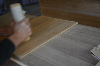 砥の粉とヤシャの混合液で桐たんす独特の仕上げを施します。