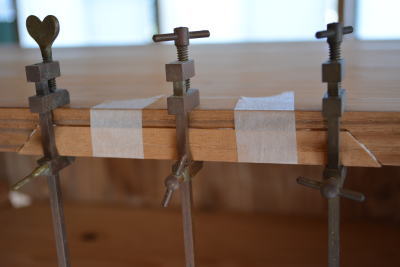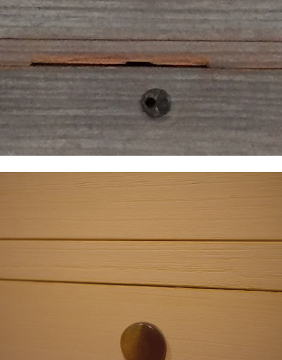はがれた部分に接着剤をつけて工具で締め付け接着させたり時には木釘で固定します。