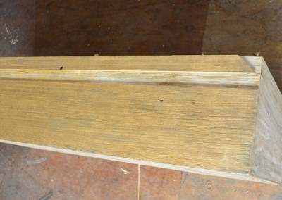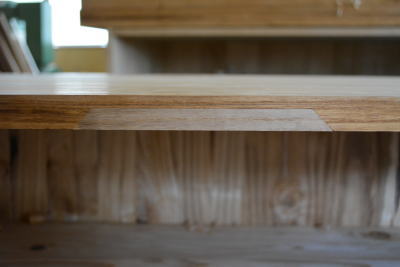 引き出しの底板が抜けている部分の修理です。古い桐たんすは接着状態が悪いので底板が抜けれいることが多いです。お届け後、いつまでもお使いいただけますようボンドでしっかり接着させます。